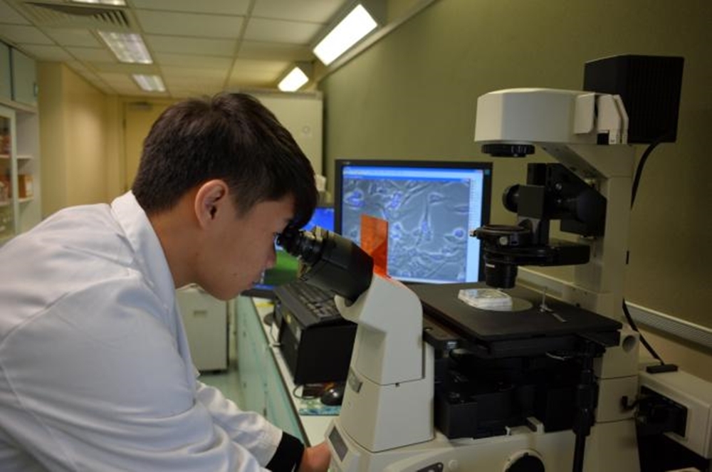 MA Ho-Him, Chairman of Neuroscience Club was observing cultured cells (SH-SY5Y cells) using Live-Cell Imaging System.